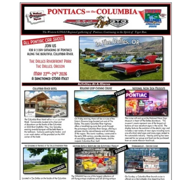 We are excited to host this year’s 2026 Pontiacs on the Columbia in The Dalles, OR – at The Dalles Riverfront Park. Over the Memorial Day weekend of May 22nd/23rd/24th